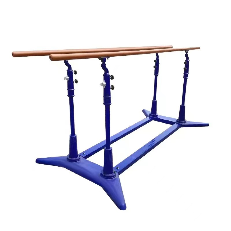 1.双杠杠面尺寸:长x横截面=3000*(50*40)mm,杠面采用复合玻璃钢材料在专用模具上经特殊加工而成,其杠面有一定的弹性与韧性,且杠面表面具有较好的手感性。2.双杠四柱脚为精密铸件,高300mm,柱脚上端设有限位装置且增设锁紧套。柱脚与柱筒连接,柱筒内立柱每50mm设一调节档,杠面高度调节范围:1300-1700mm之间。3.底座采用δ6的优质钢板压制成型,通过螺栓联成“井”字形结构,便于拆装,底座下设置有橡胶垫块,保持产品在使用过程中有良好的平衡性和抗震性。4.双杠两杠面间距可调。